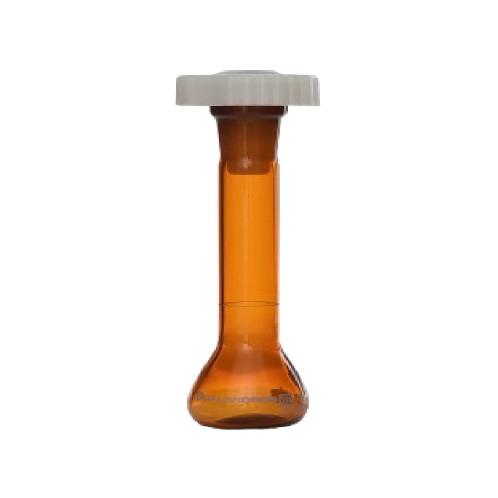 BALÃO VOLUMÉTRICO DE VIDRO CLASSE A, COR ÂMBAR, COM TAMPA DE POLI