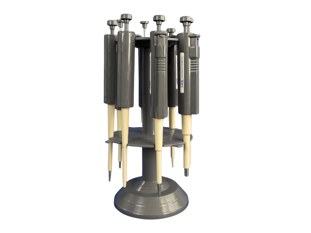 | Estante para Pipetador – Modelo ES1 A estante giratória KACIL Modelo ES1 é fabricada em plástico e possui capacidade para acomodar até 8 pipetadores monocanais. Marca: Kacil |