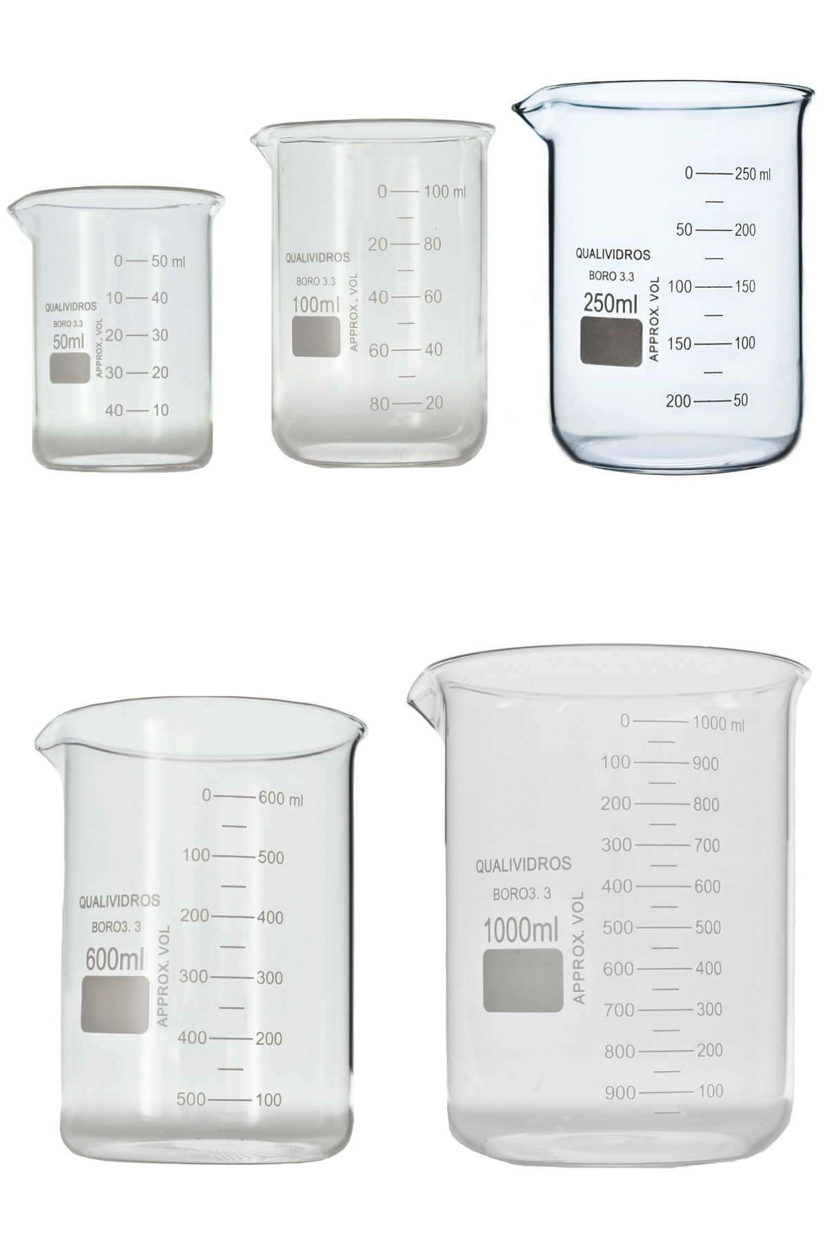 KIT 5 COPO BECKER FORMA BAIXA DE VIDRO CAP. 50, 100, 250, 600 E 1000ML