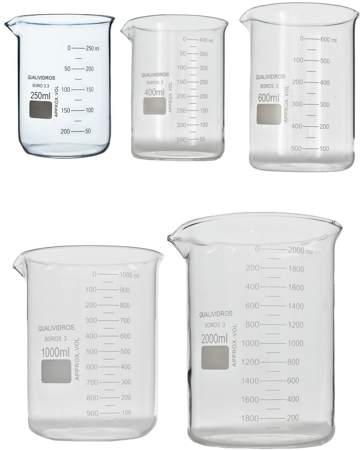 Becker de forma baixa (Griffin) Kit com 5 peças ( 250, 400, 600, 1000, 2000ML ) Espessura mínima de 2mm. Com graduação de escala dupla Material: Vidro borossilicato 3.3 Marca: Qualividros |