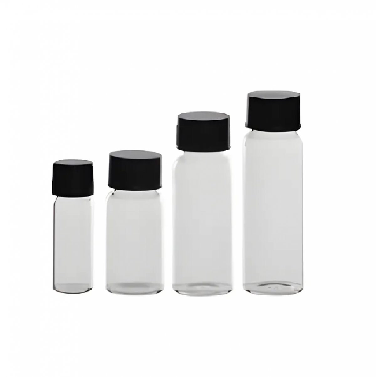Flaconete de vidro incolor com tampa de rosca. Marca: Qualividros. |
